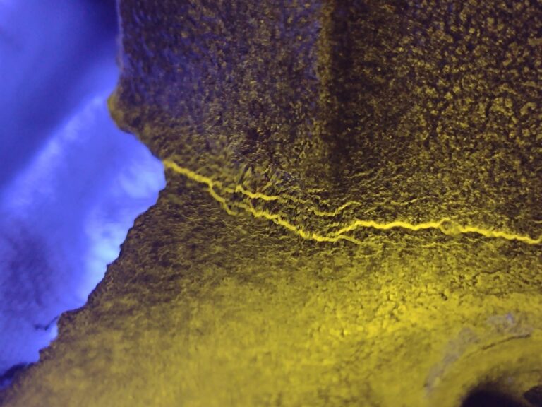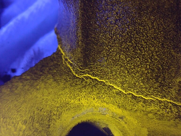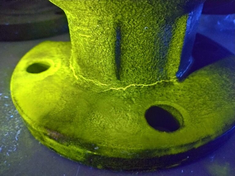 Serviço realizado pela empresa, com aplicação da técnica de partículas magnéticas fluorescentes em válvulas industriais, com o objetivo de identificar trincas e descontinuidades superficiais ou subsuperficiais em materiais ferromagnéticos.